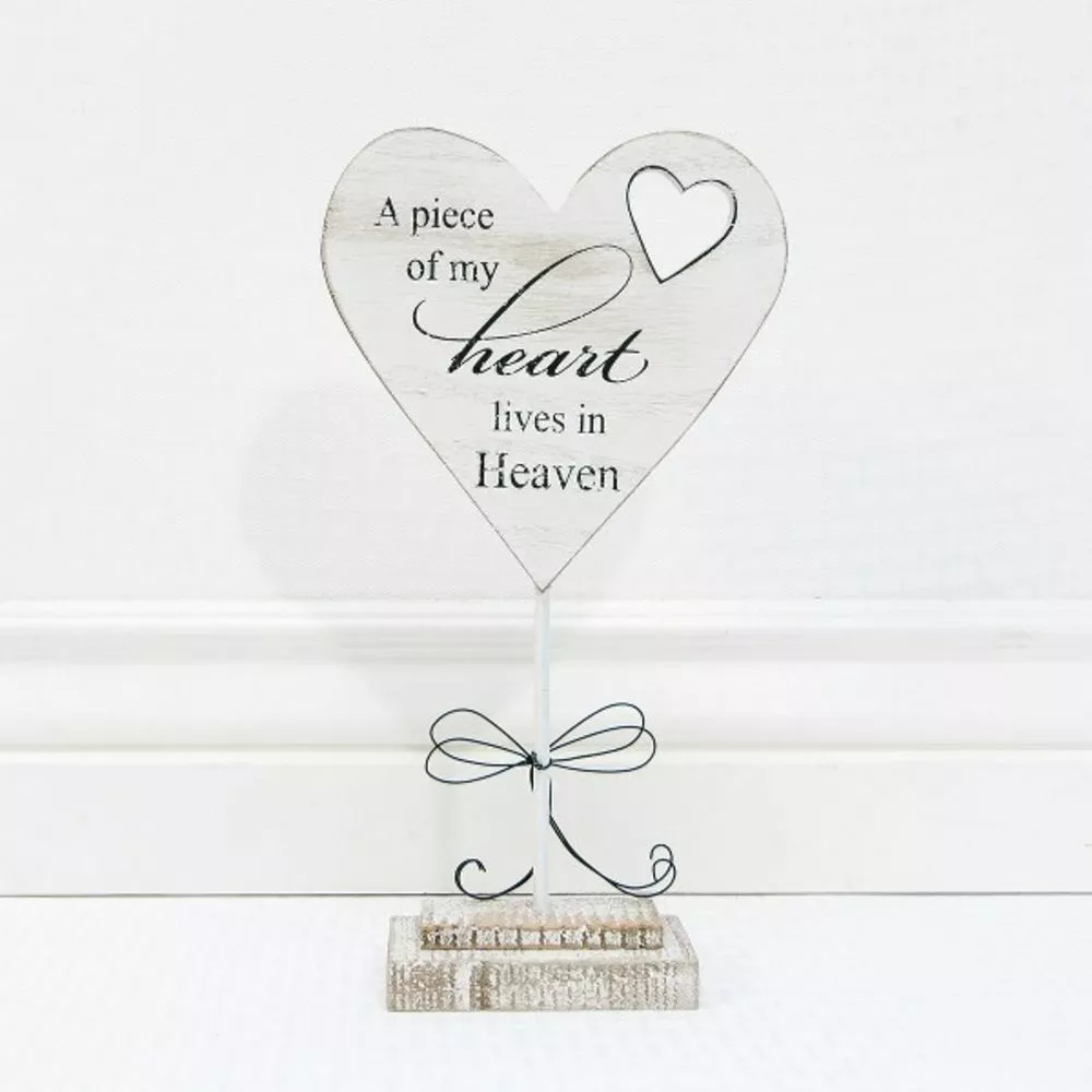 It reads “A piece of my heart lives in heaven.” Designed specifically to coordinate with today’s popular colors and themes, this wooden sign may be just the decoration you are looking for.
