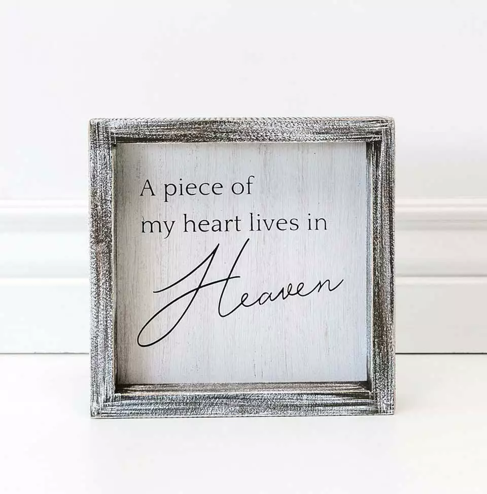 This wood-framed sign displays “A Piece Of My Heart Lives In Heaven” in distressed white and black colors.