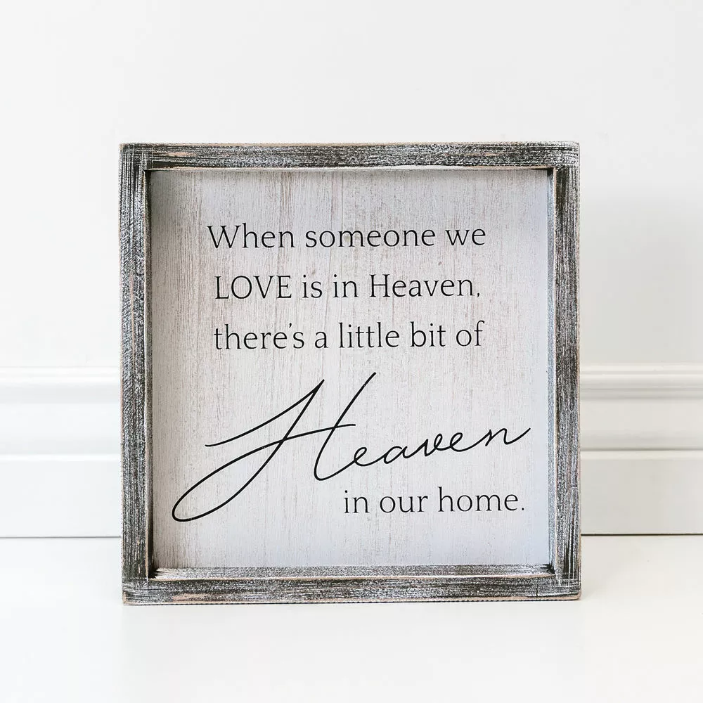 This wood-framed sign which boldly displays “When Someone We Love Is In Heaven, There’s A Little Bit Of Heaven In Our Home.” in distressed white and black colors. It makes the perfect gift for someone who is greiving the loss of a loved one.