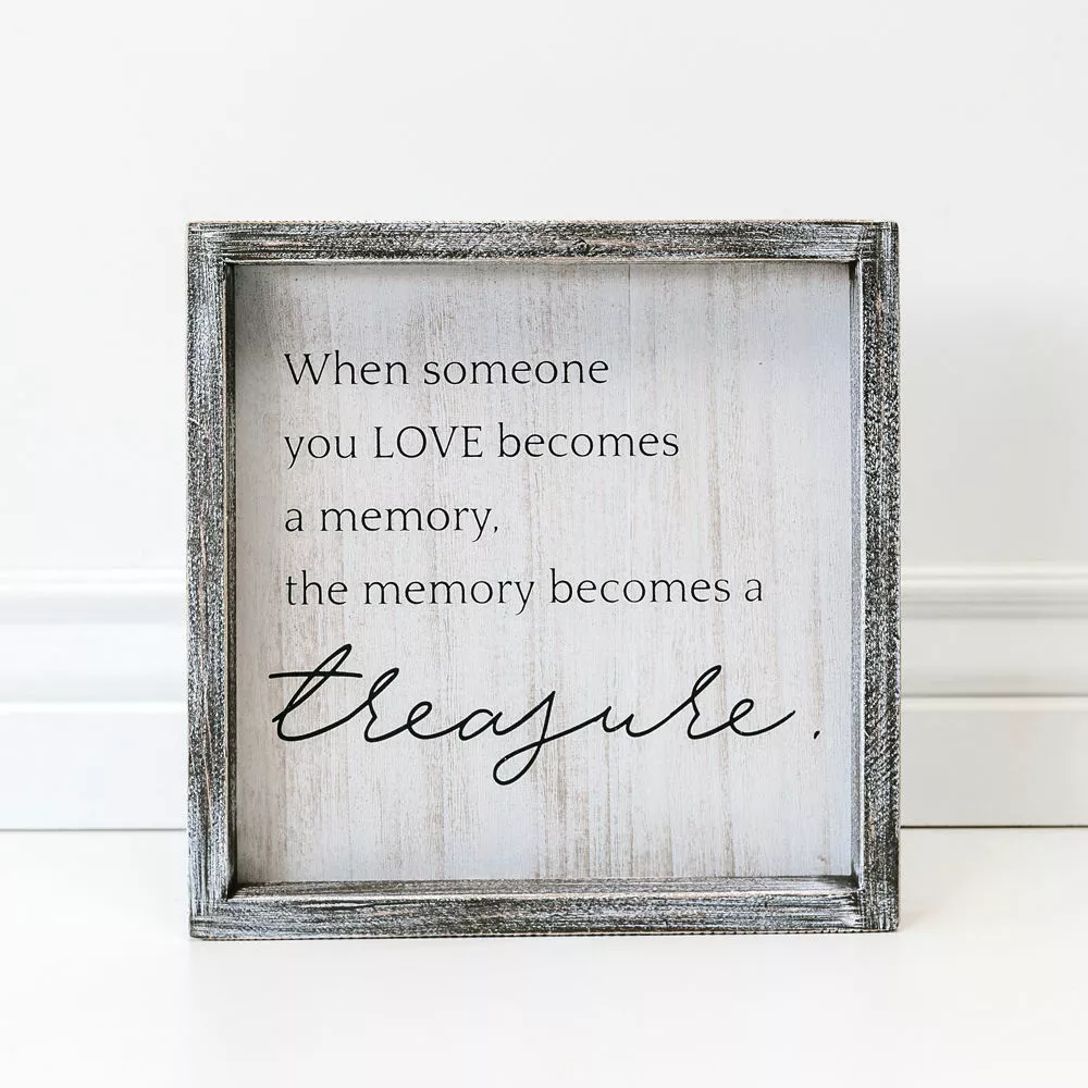 This wood-framed sign which displays “When Someone You Love Becomes A Memory. The Memory Becomes A Treasure.” in distressed white and black colors.