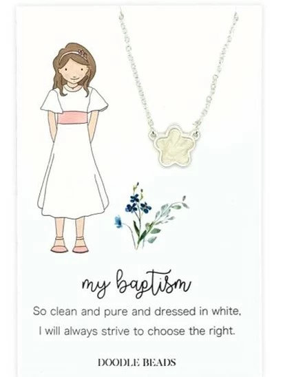 I am a Child of God card with Dainty flower Necklace filled with pearl epoxy. A cherished keepsake necklace for any girl. Baptism gift, Birthday Gift, baptismal preview. Quote: “My Baptism – So clean and pure and dressed in white, I will always strive to choose the right”