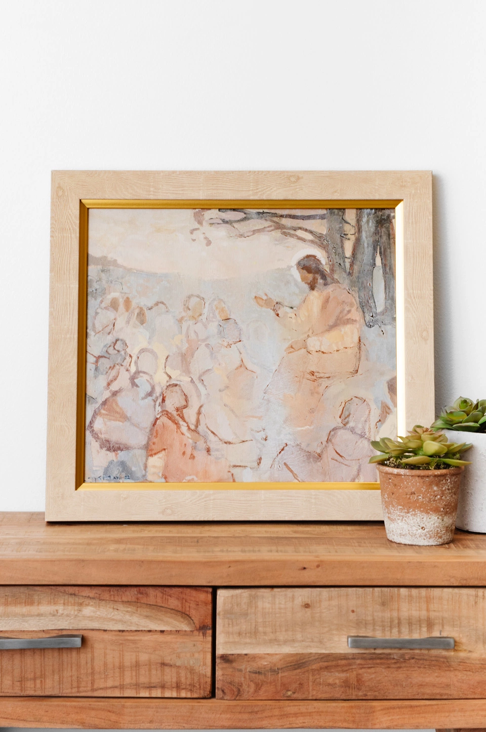 Add this beautiful image to your fine art collection at home. This modern take on Christ teaching His people will look stunning and make a statement wherever you decide to place it.