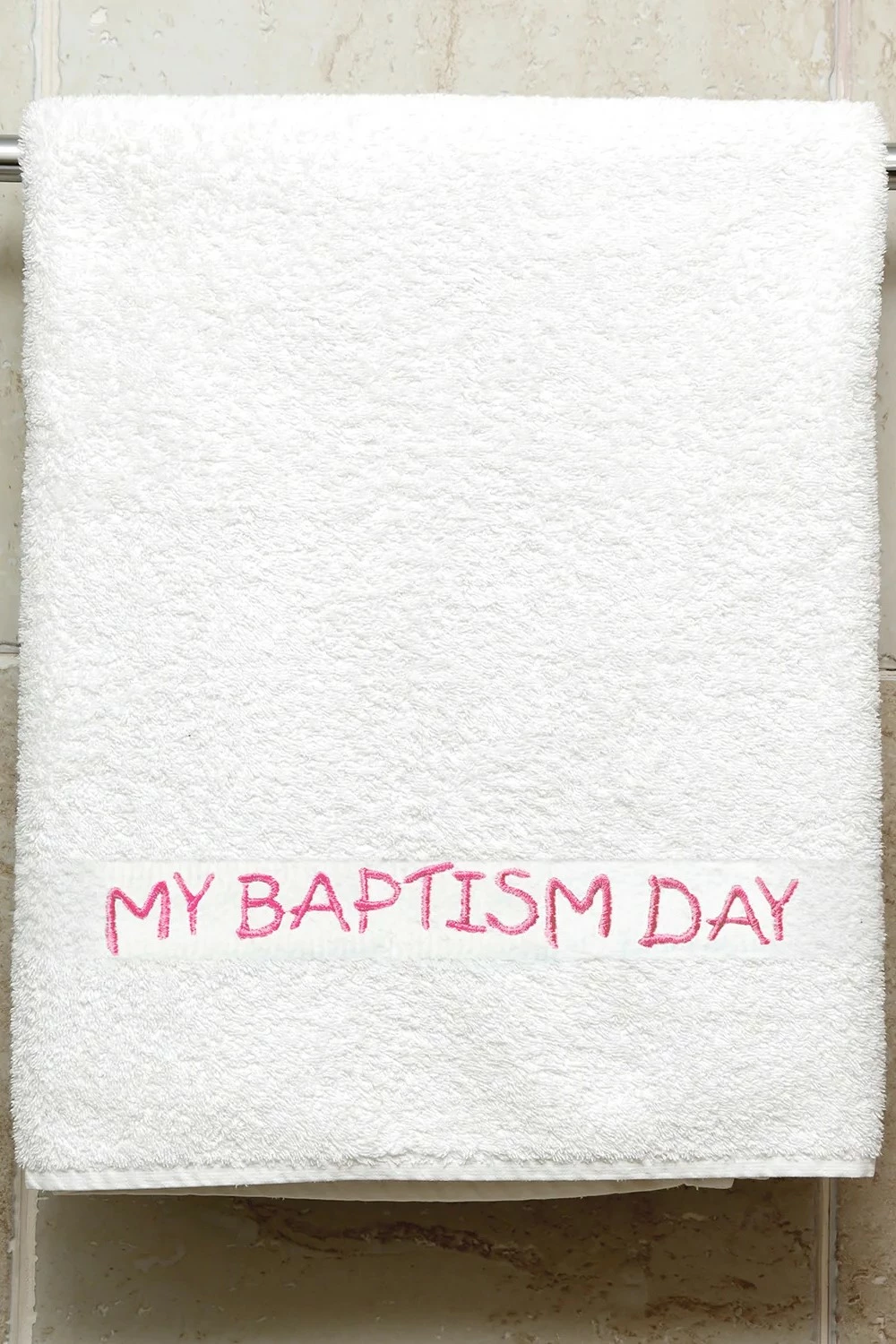 “My Baptism Day” embroidered on a white cotton towel with pink thread.