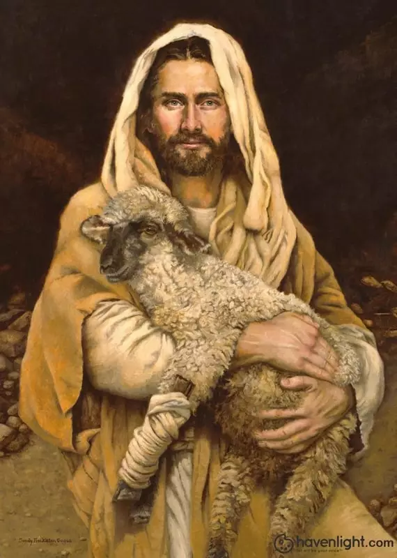 A portrait of Jesus holding a lamb by Sandy Freckleton Gagon.