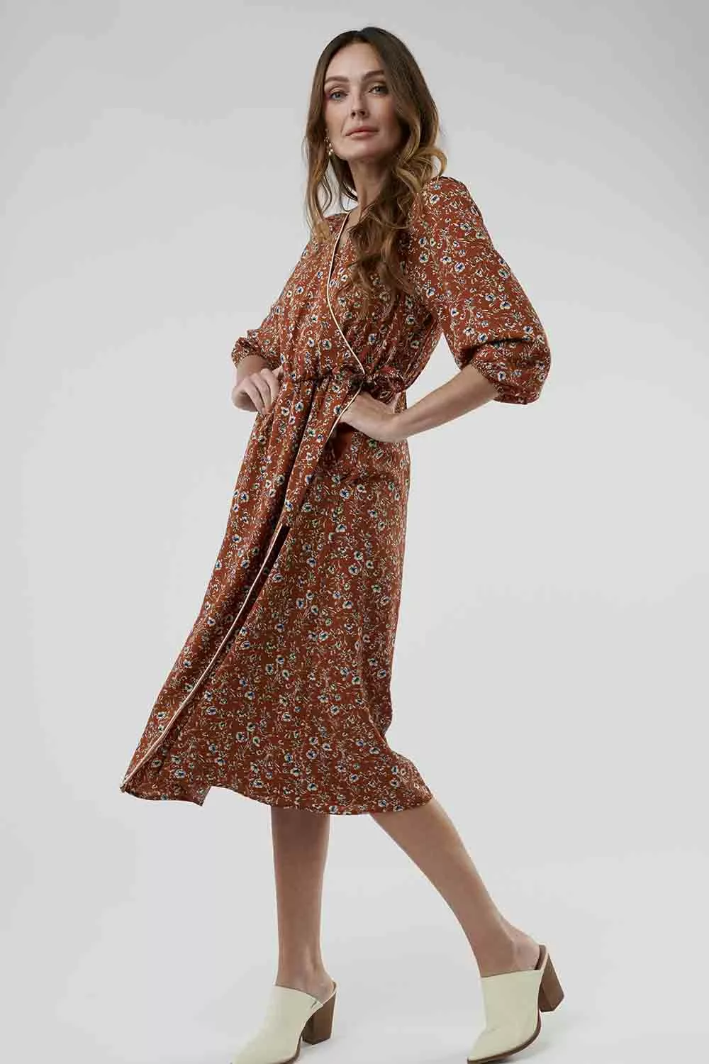Floral, flowy, and fabulous. This midi dress with a wrap skirt and 3/4 sleeves bridges the gap between summer and fall perfectly.