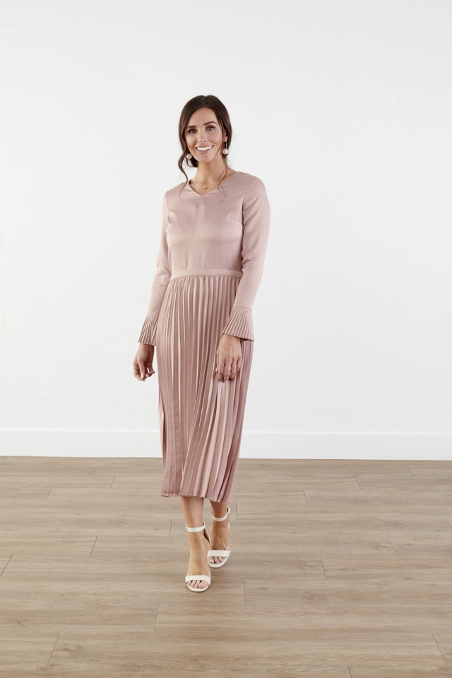 Pleats, pleats, and more pleats! This pretty pink dress has adorable pleats on both the skirt and the sleeves. Its flattering A-line shape and convenient zipper in the back make it a winner in class and comfort.
