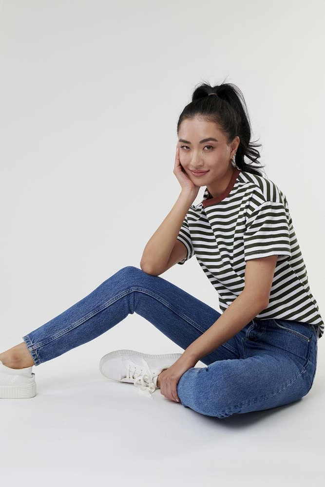 Stripes will never go out of style, and we are loving the look of this boxy striped shirt. Comfortable and modest with a higher neckline, this top will bring a classic, vintage feel to your closet.