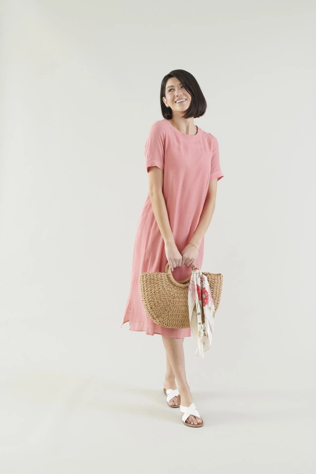 This midi dress is so simple and yet so chic. Featuring a rounded neckline, cuffed sleeves, and small side slits, it is a perfect breezy summer dress!