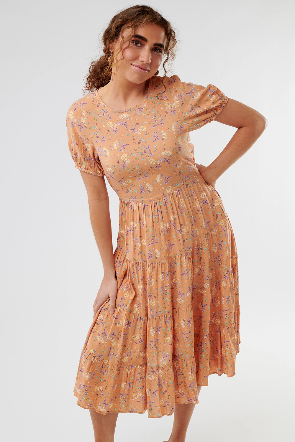 Puffed sleeves and a dreamy floral pattern are the perfect pairing in this knee-length dress. Perfect for church or fun, this dress is sure to be a delightful addition to your closet.