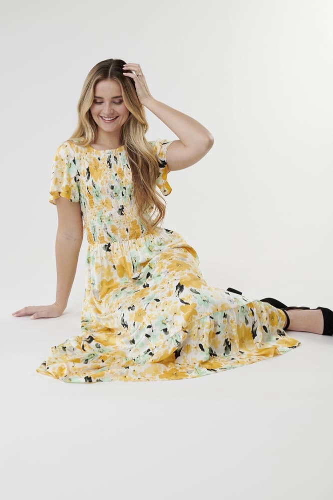 Every beautiful woman deserves to get some beautiful flowers, and you are beautiful. We are bringing you flowers in the form of a gorgeous, sunshiney dress with delicate flutter sleeves and a back keyhole. To add to all of that, this dress also has pockets and a flattering a-line skirt.