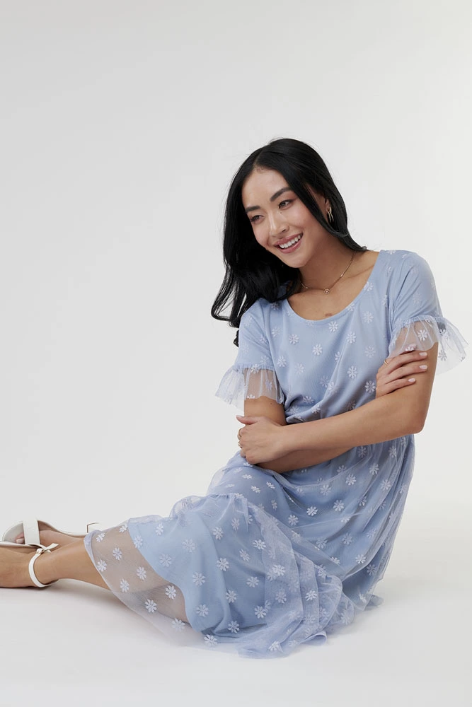 This soft-tulle A-line dress is stunning in its simplicity with ruffled sleeves, a back keyhole, and a comfortable elastic waist.