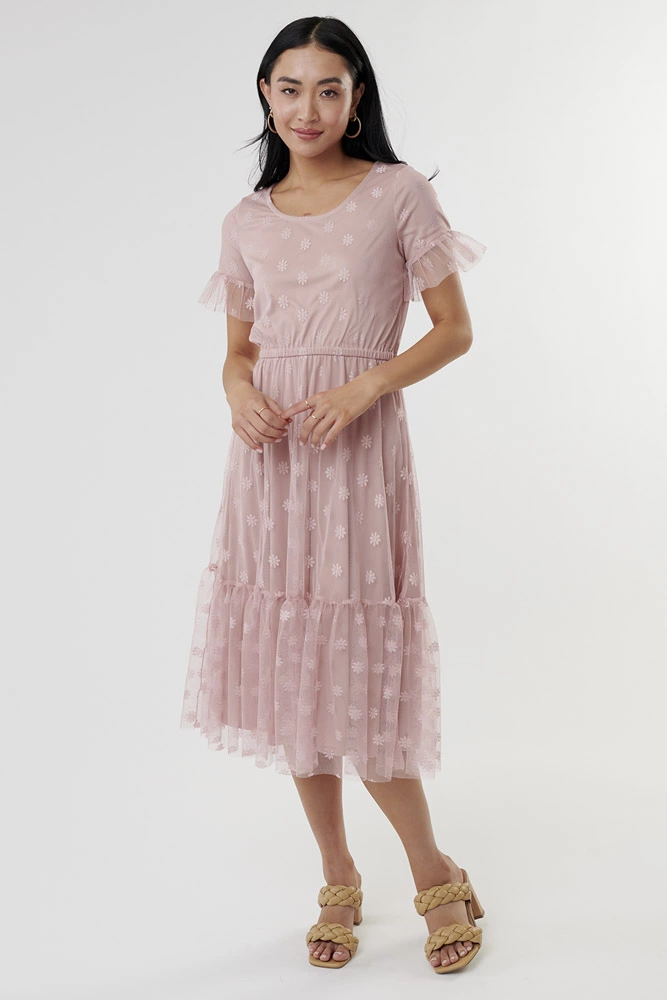 This soft-tulle A-line dress is stunning in its simplicity with ruffled sleeves, a back keyhole, and a comfortable elastic waist.