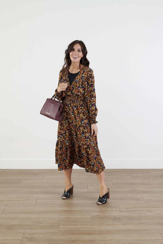 This floral maxi dress features a thick smocking waist and a wrap bodice. It is sure to be both comfortable and flattering!