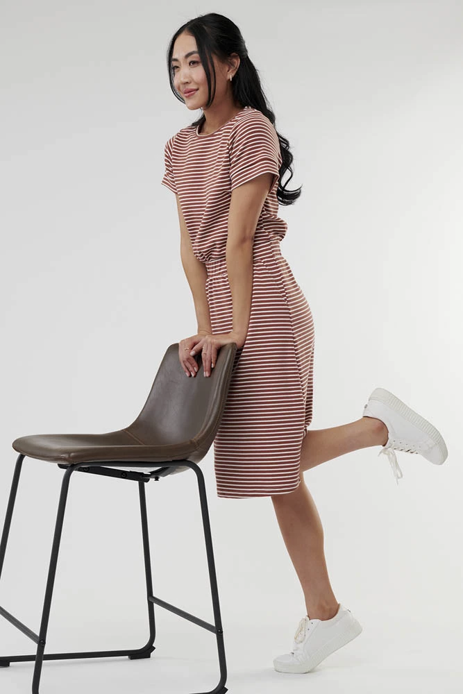 This casual dress is made in a comfortable knit fabric, and it is sure to become one of your go-to outfits. Knee-length with an elastic waist and pockets, this dress has it all.