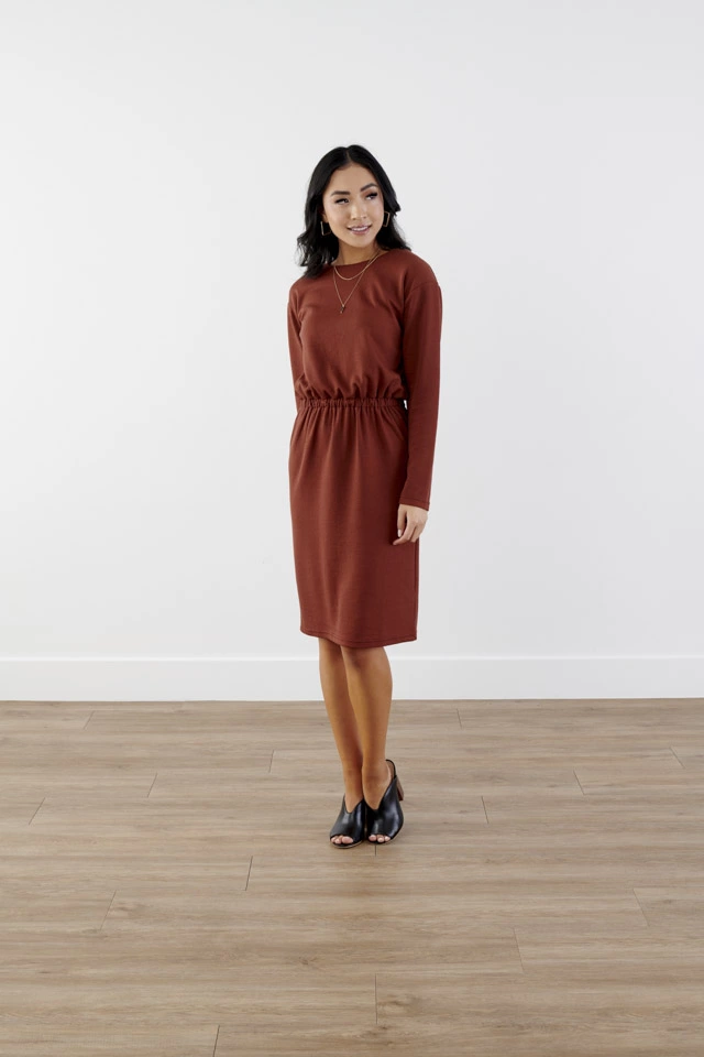 This pencil dress has such a lovely shape to it! It has a drop shoulder and an elastic waist which flows into a pretty pencil skirt. We hope this beautiful piece keeps you warm this season!