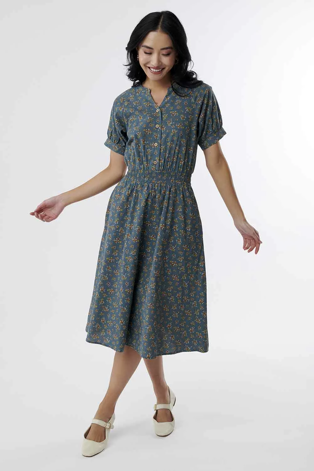 Puff sleeves and florals are the perfect combination for spring. This button-down dress also has pockets and a smocked waist and is nursing friendly!