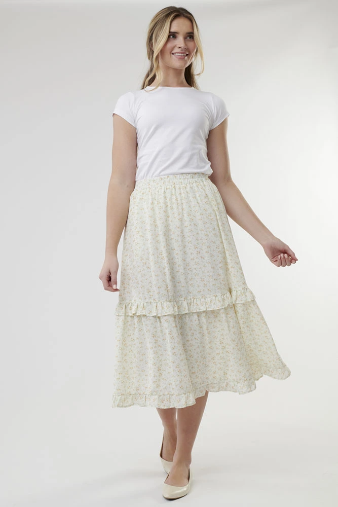 This floral A-line skirt is the perfect pairing to any simple or solid-colored blouse (or T-shirt, if you are looking to go more casual!). It features a flattering tiered design and a comfortable elastic waist.