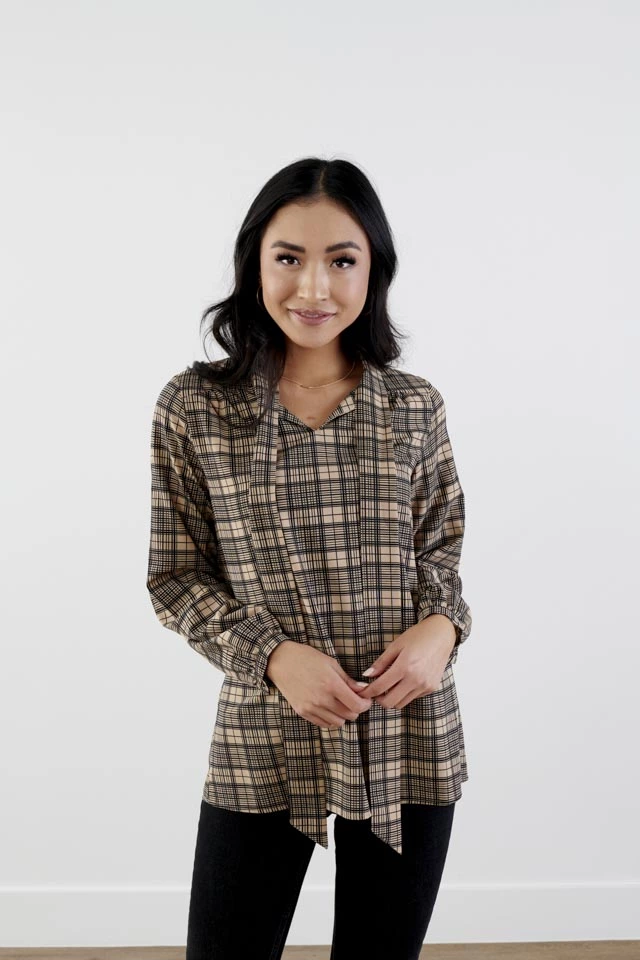 This chic, darling top is a must-have this season! Its soft and inviting black and biege plaid pattern combined with the adorable tie neck make it a show-stopper blouse everyone will love.