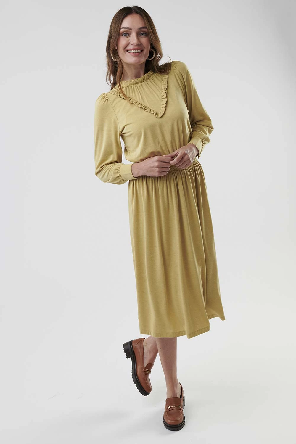We are loving ruffles this season! The fun ruffle neck on this dress is complemented by a flattering a-line skirt and cuffed sleeves.
