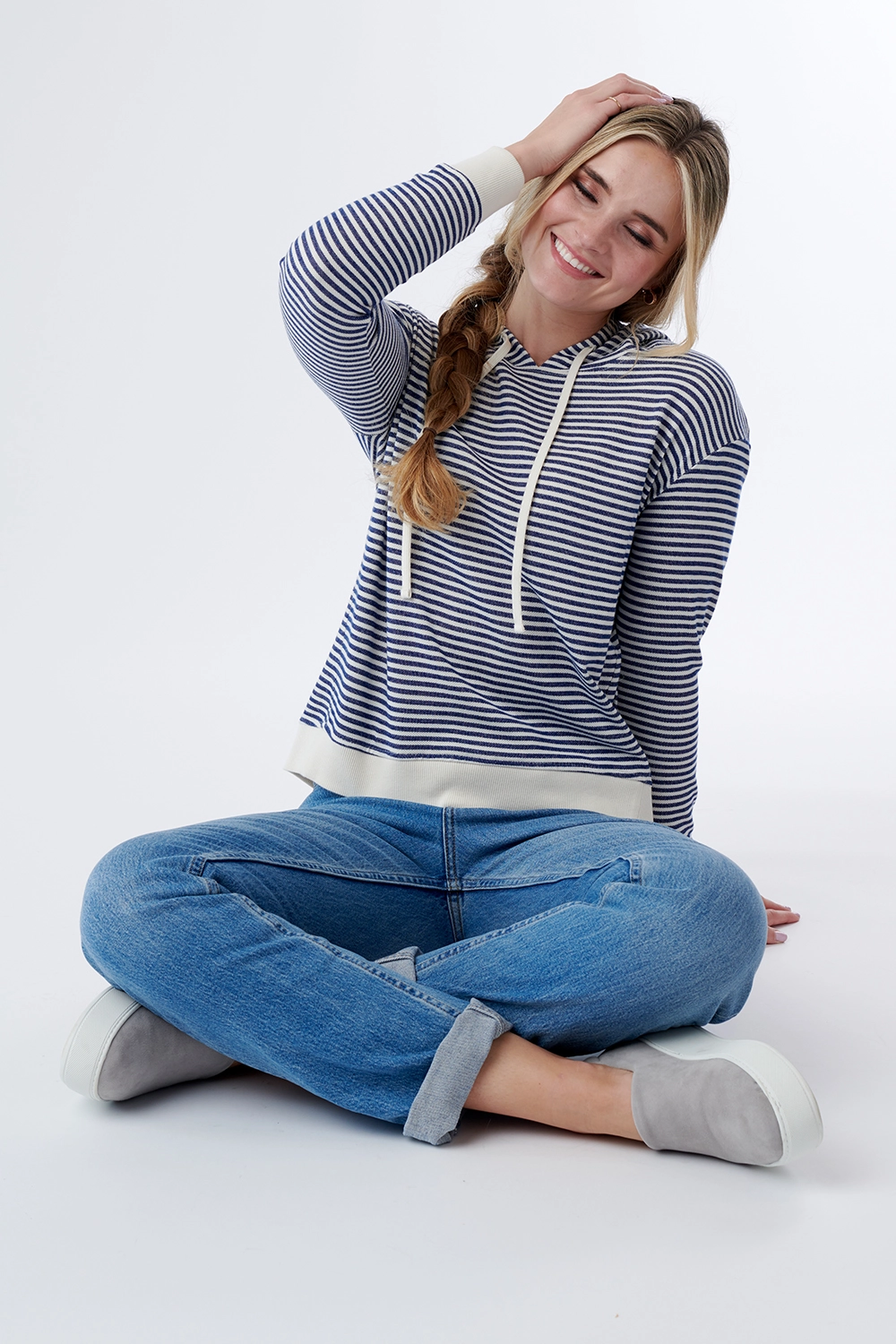 Our new hooded top combines comfort and the classics with a fun striped pattern. With long sleeves, a higher neckline, and a dropped shoulder, this top will be your go-to choice for those cooler spring mornings and nights.
