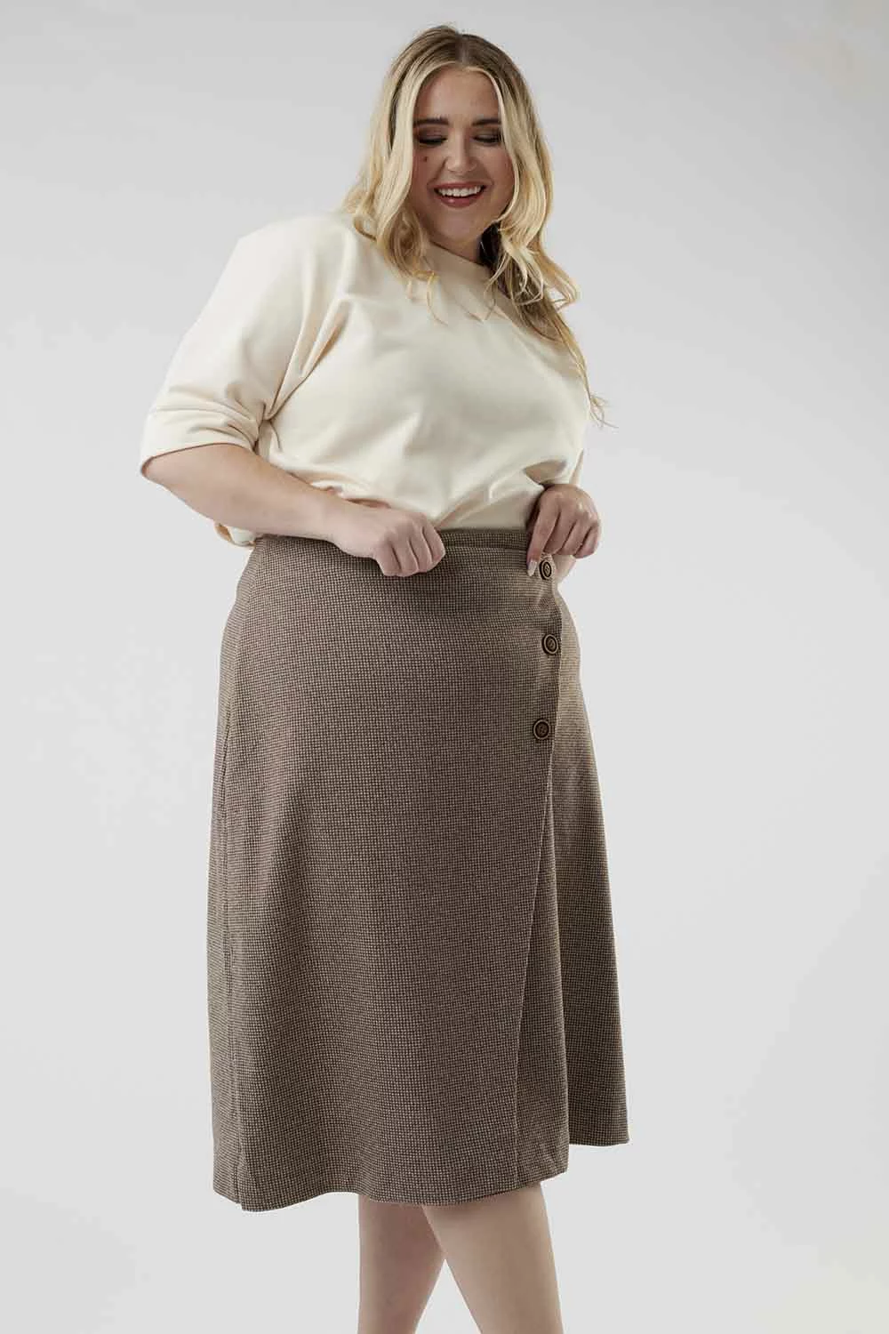 Why choose between pretty and professional when you can have both? This faux-wrap skirt with an a-line cut is both flattering and unique with its darling side buttons.